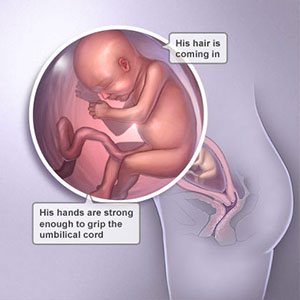 In aceasta saptamana de sarcina bebelusul si-a format pe deplin amprentele digitale, parul de pe cap este in continua crestere, genele si sprancenele sunt dezvoltate complet. Prin stetoscop pot fi auzite bataile inimii. In aceasta perioada copilul incepe sa loveasca in burtica sa se miste mai mult. Zgomotele puternice exterioare il pot trezi, povestile, cantecele, teatrul sunt indicate sa fie ascultate sau spuse de catre parinti. Daca bebelusul dumneavoastra este baietel, acum se formeaza scrotul si testiculele incep sa coboare din pelvis in scrot. Unghiile au crescut si acopera varfurile degetelor.